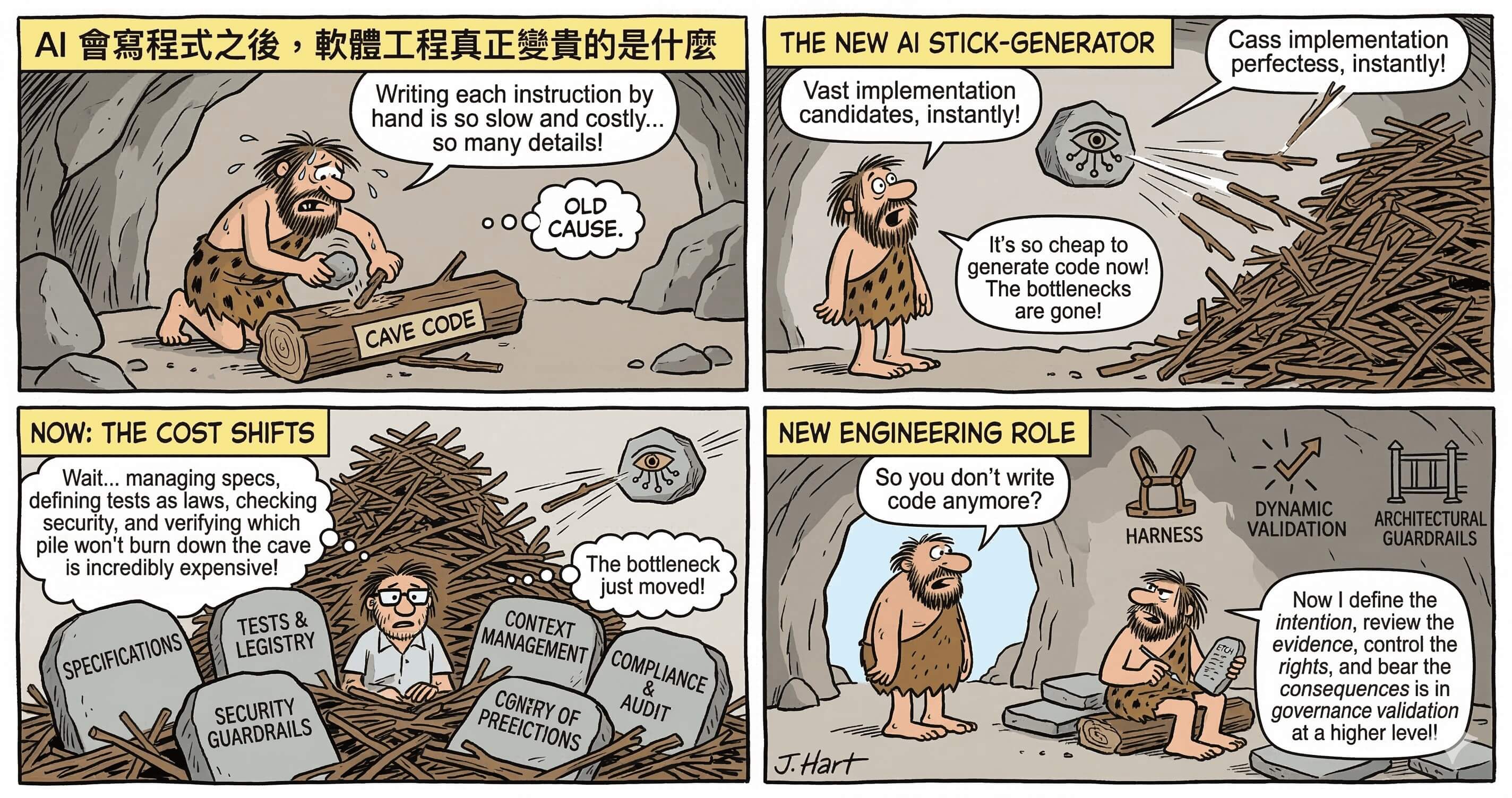 因為它真正說明的,不是「工程快要不重要了」,而是「當模型更強時,規格、測試與 benchmark 設計反而變得更重要」。一旦能力上來,先暴露出來的不是工程不再需要,而是驗證與治理的缺口被照得更亮。這恰恰回到本文的中心命題:能力提升,沒有讓治理退場,反而把治理的必要性放大了。